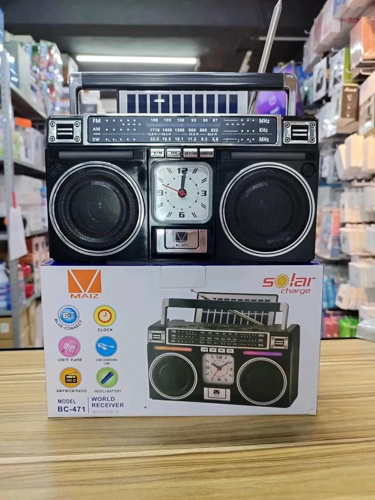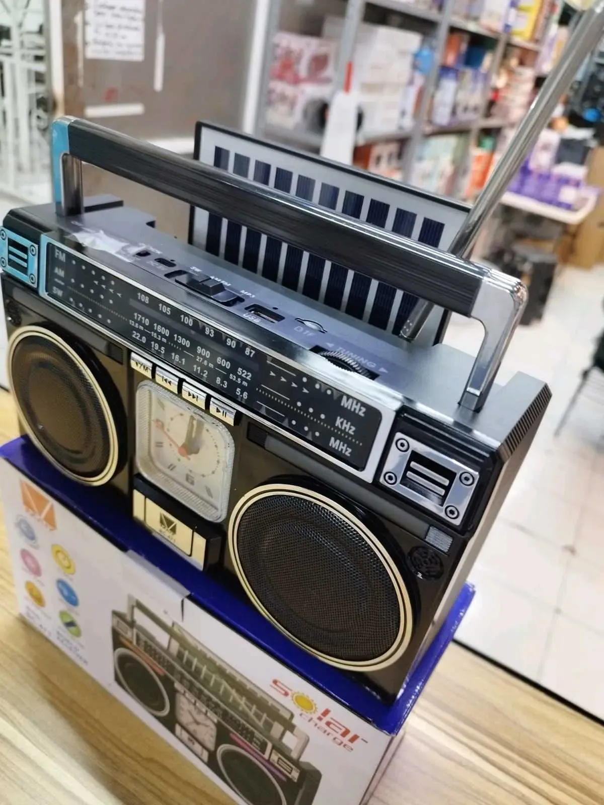 Bocina Bluetooth con radio FM am ranura para memoria USB micro SD conexión alimentación energía mediante carga tipo c con celda solar incluye un pequeño reloj en la parte del medio