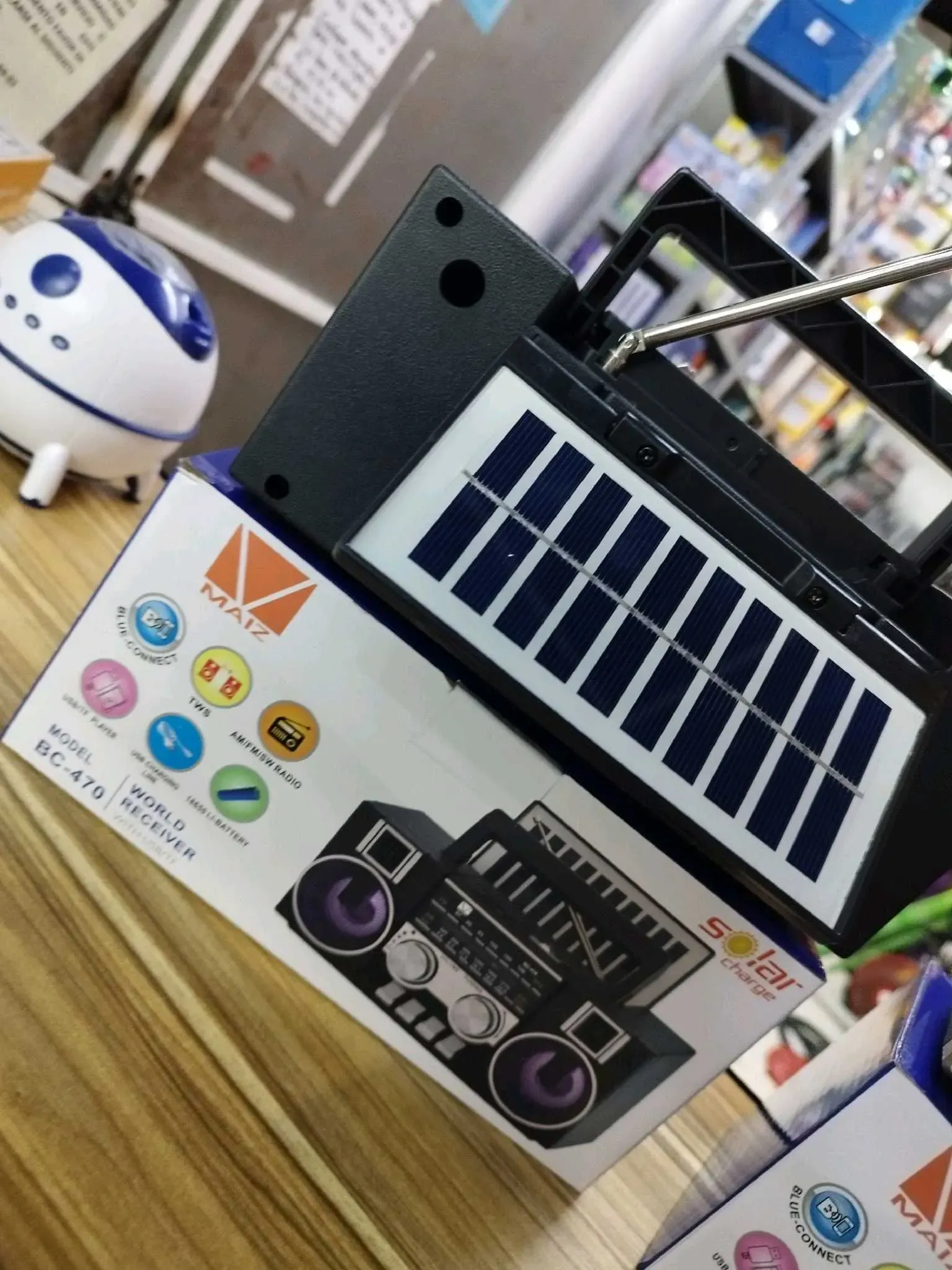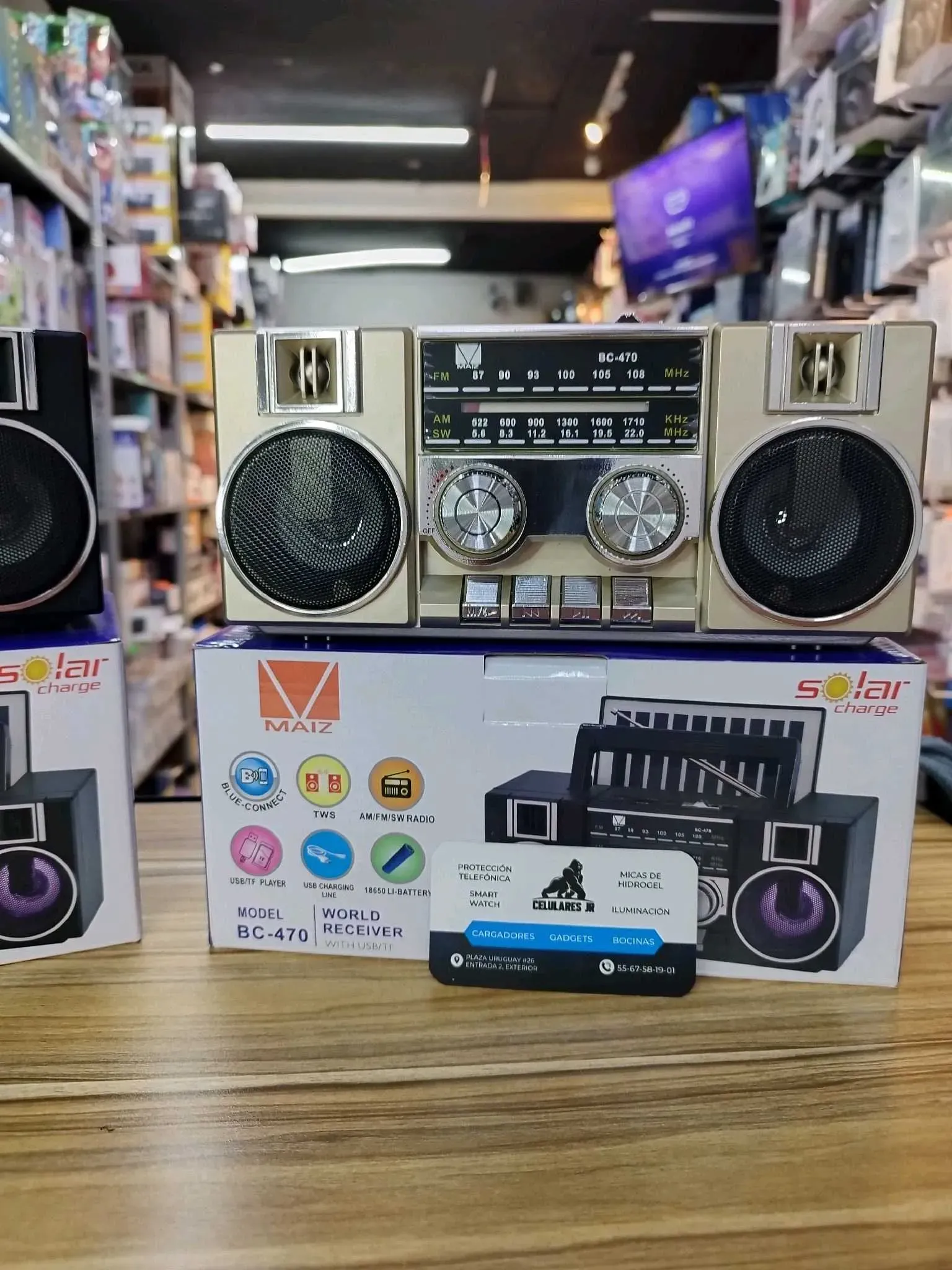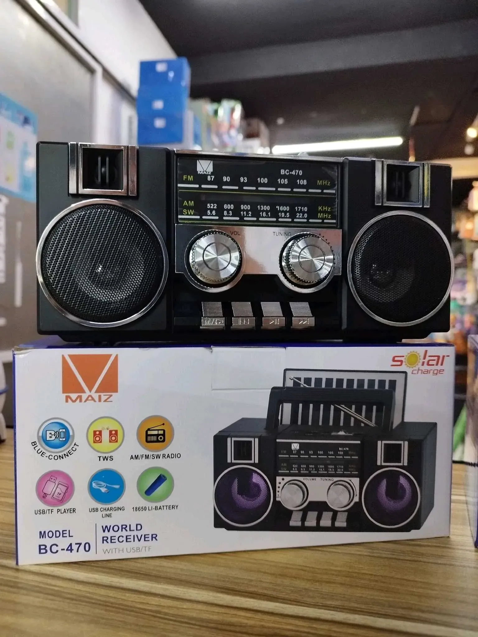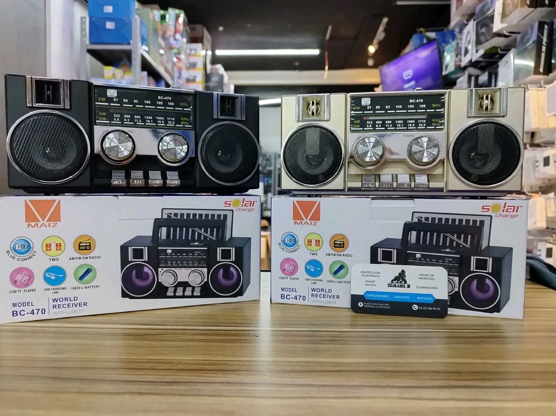 Grabadora retro con sintonizador de radio FM am y SW tres bandas recargable con iluminación en luz led conexión recargable tipo c ranura para USB y micro SD Bluetooth panel solar parte trasera