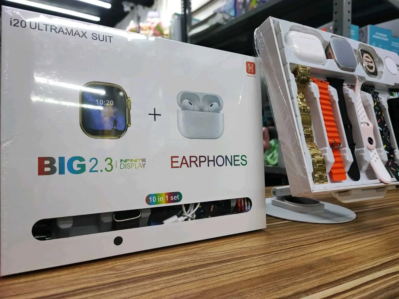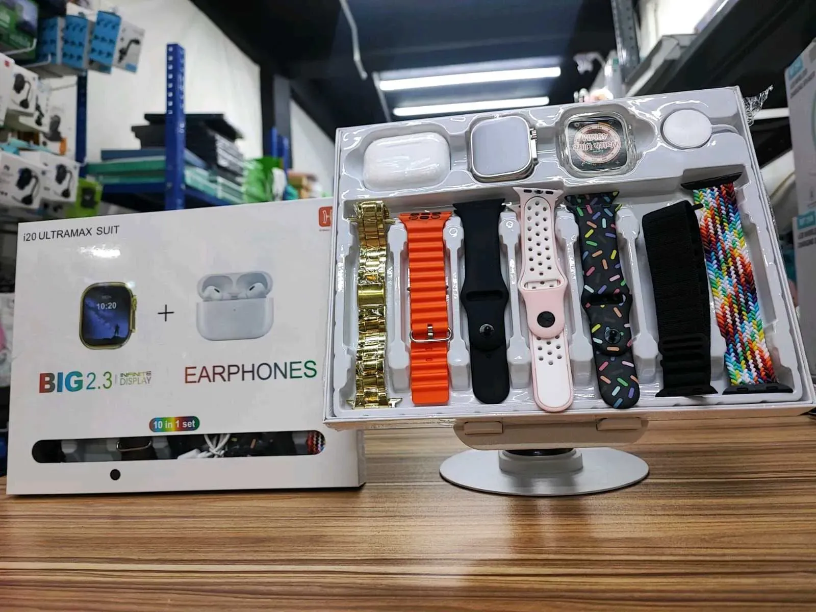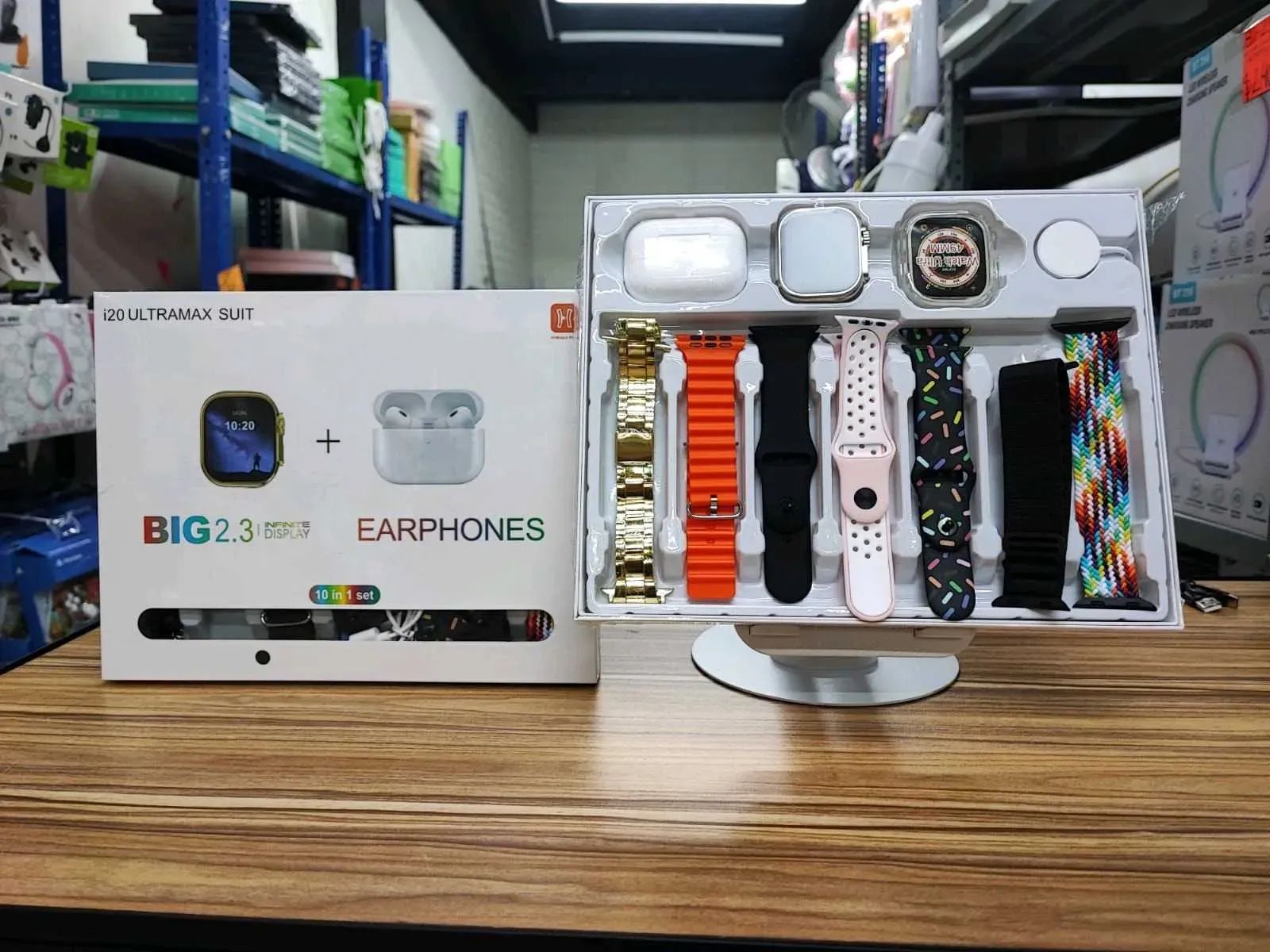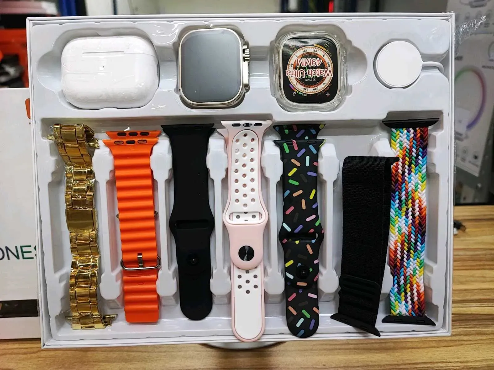 Smartwatch i20 ultramac suite reloj inteligente con pantalla de 2.3 pulgadas Infinity display set 10 en 1 incluye siete straps intercambiables cable cargador bumper para smartwatch reloj inteligente y audífonos y grupos de regalo